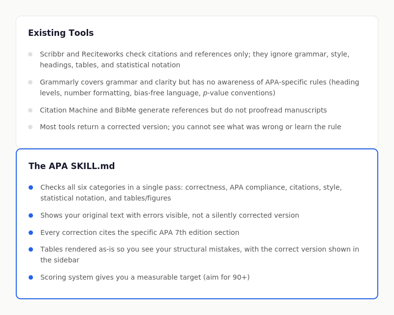 I reviewed every major APA checking tool before building this. The landscape splits into two camps: citation-only checkers and general grammar tools.